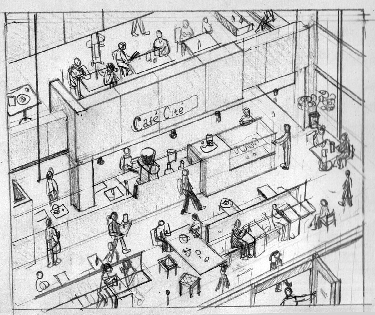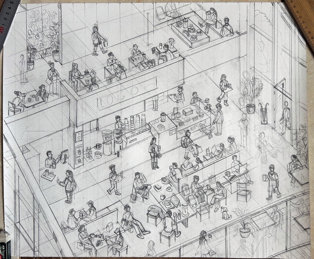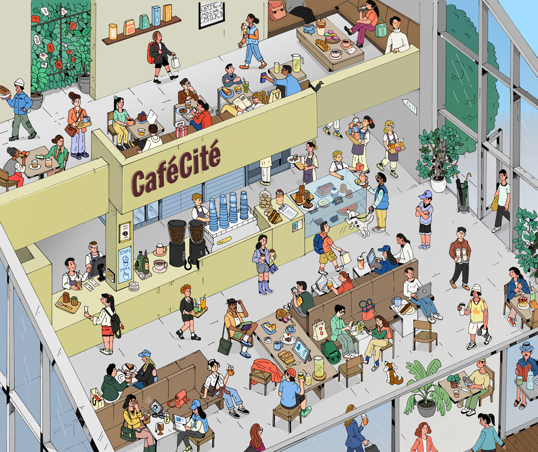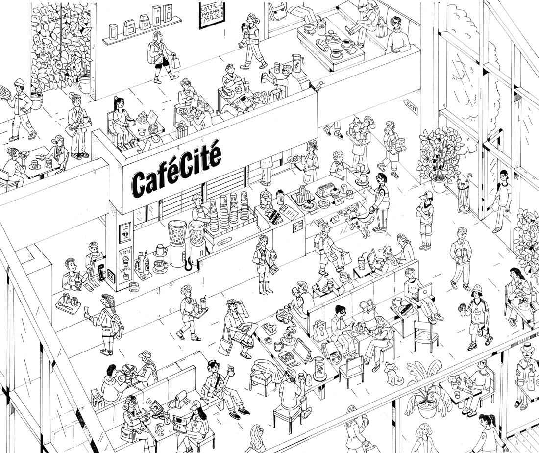 Promo illustration about freshly opened CafeCite coffee shop in Seoul city (IG: