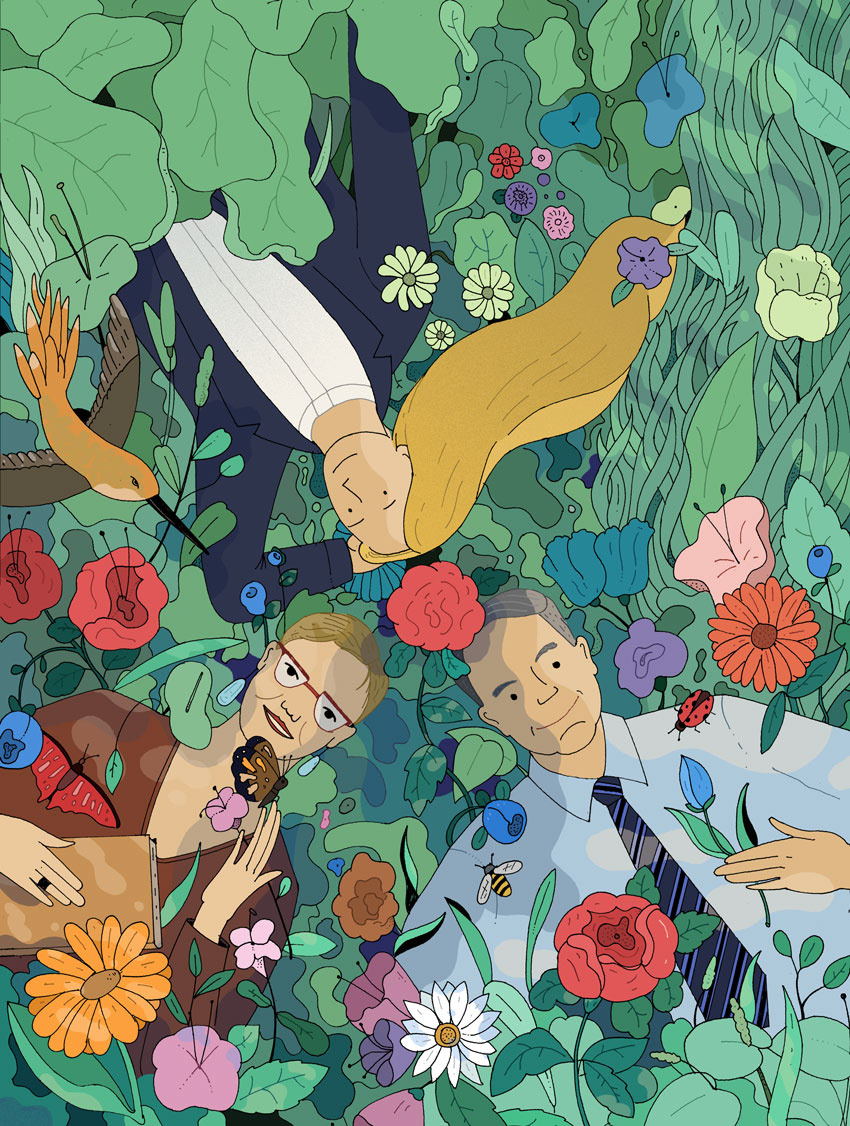 The Cover tells about 3 new ministers coming up to the new parlament. All three are Green Party members. So together with Art Director we came to idea to show them laying in the meadow grass surrounded by flowers and insects.