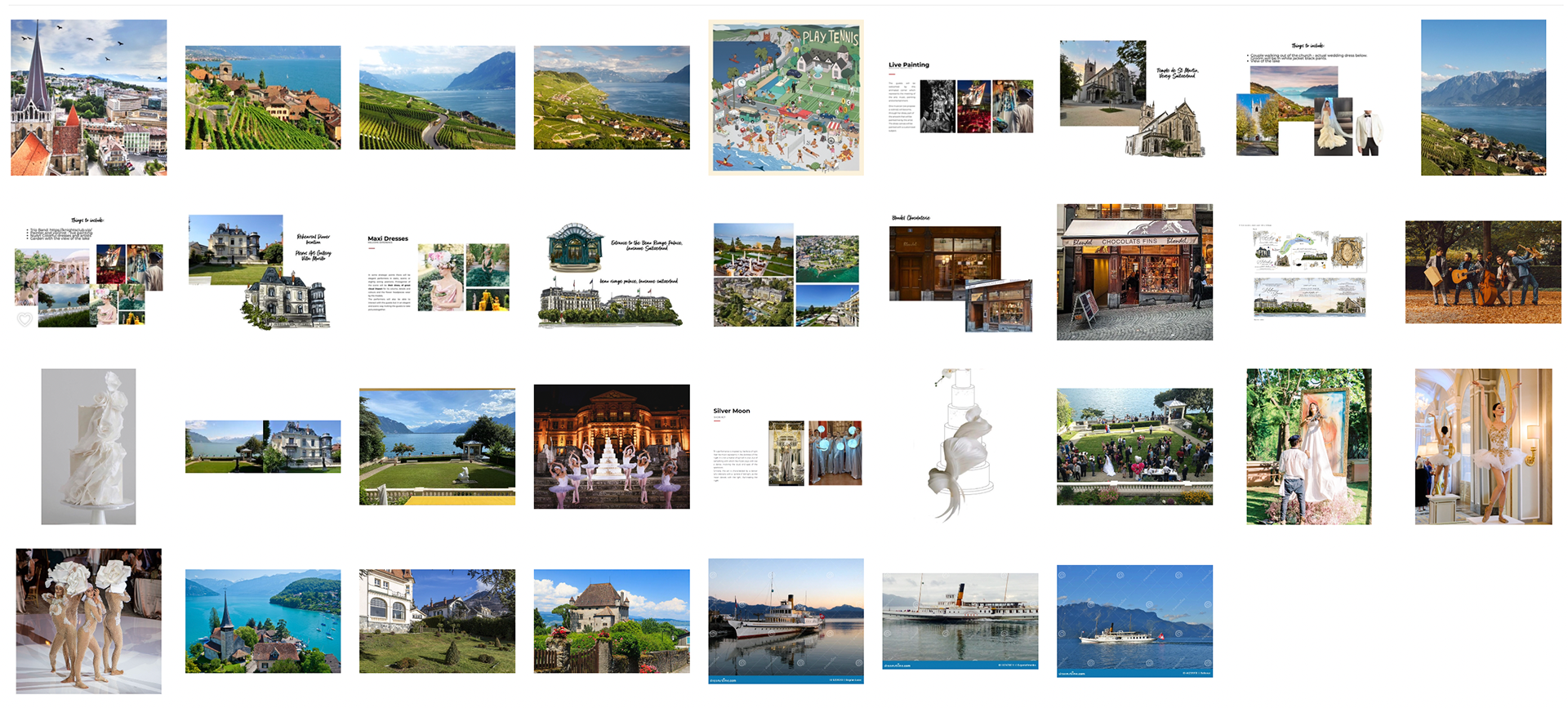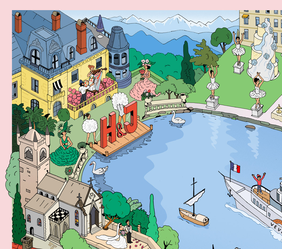Some of key wedding party details are depicted at this scar illustration (like ship cruise, ballet dance, wedding church, music band etc).